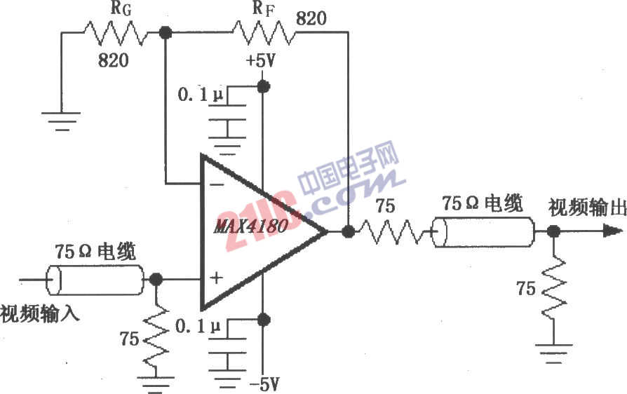 如圖所示為由MAX4180構(gòu)成的視頻線驅(qū)動(dòng)放大器電路。MAX4180適用于作為同軸電纜傳輸線放大視頻信號(hào),為了使傳輸過(guò)程反射最小,負(fù)載上獲得最大功率,選擇終端阻抗等于傳輸線特性阻抗(75Ω)。MAX4180起到中間放大作用,將電纜輸入的視頻信號(hào)放大后輸出,由電纜線繼續(xù)傳輸。在信號(hào)傳輸過(guò)程中電纜線的頻率響應(yīng)會(huì)有變化。