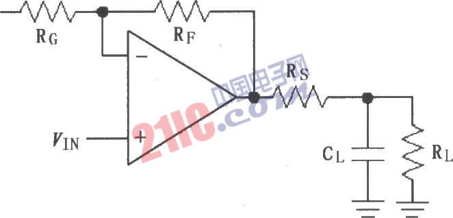 如圖所示為由MAX4180~MAX4187采用隔離電阻Rs構(gòu)成的驅(qū)動(dòng)電容性負(fù)載電路。該電路在輸出端與負(fù)載之間加了一個(gè)隔離電阻Rs,用于抑制過沖振鈴和振蕩,Rs阻值為5~22Ω。