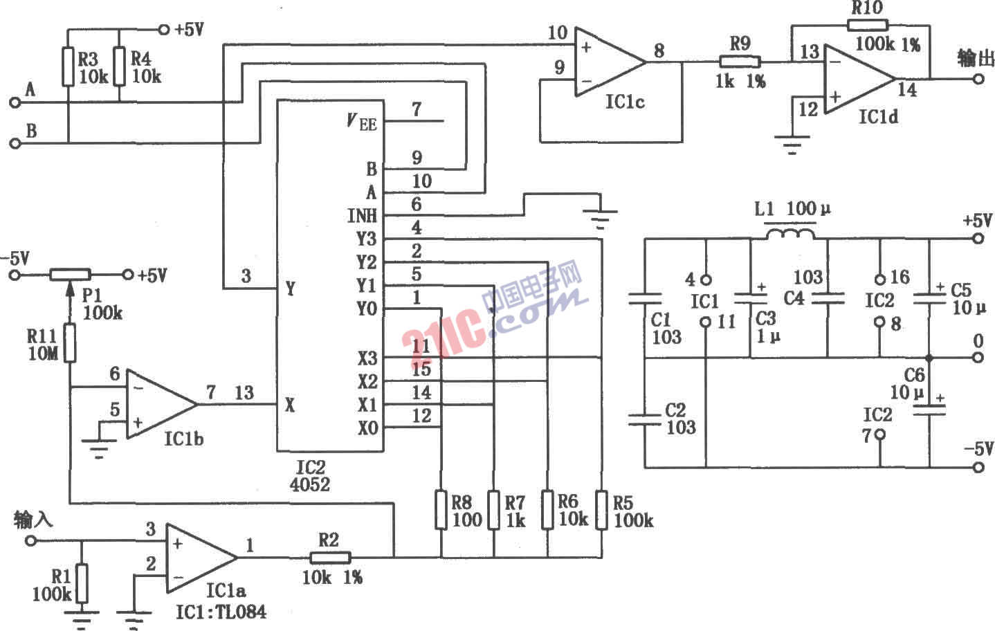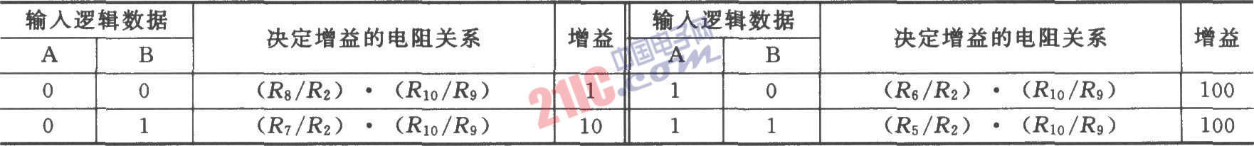 如圖所示的放大電路可在4種邏輯電平的控制下,分別提供l、10、100、1000倍的放大倍數(shù),每種放大倍數(shù)下的帶寬均大于30kHz,整個電路在使用±5V供電時電流不大于7mA。A、B端輸入邏輯與增益的關(guān)系: