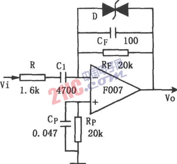 如圖所示為低噪聲微分電路。該電路是在基本微分器基礎(chǔ)上增加少量元件,從而具有過載保護(hù)能力,穩(wěn)定性好且噪聲低。R的接入能使電路穩(wěn)定,并起減小噪聲和增大輸入阻抗的作用。在微分器工作頻率不高時(shí),為了更好的抑制高頻噪聲,加了電容Cp。穩(wěn)壓管D是考慮有可能突然出現(xiàn)很大的單極噪聲而設(shè)置。Cp是用于將Rp上的熱噪聲旁路,并能保持回路穩(wěn)定。