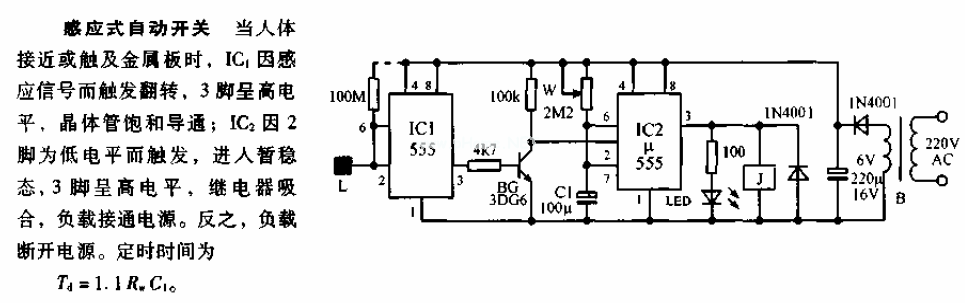 這是一個用4013組成的觸摸開關(guān)電路,只要用手觸摸一次開關(guān)即可接通,再觸摸一次開關(guān)斷開。由于CMOS電路的輸入端均為場效應(yīng)管結(jié)構(gòu),而場效應(yīng)管是一種電壓控制元件,它有極高的輸入阻抗,約幾十兆歐。它