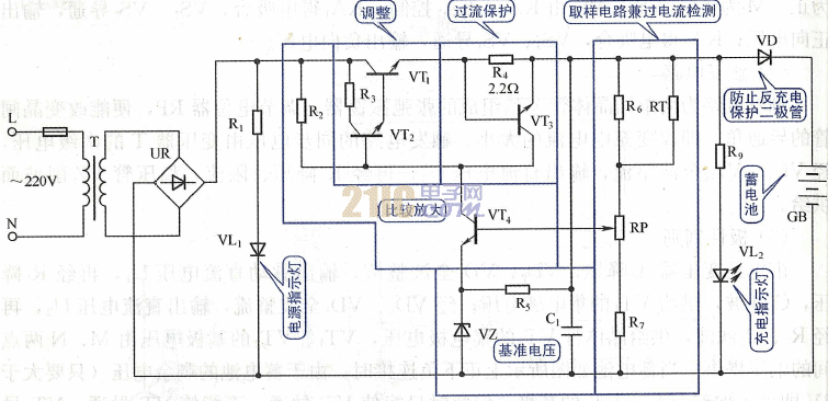 電路原理:電路經(jīng)過變壓、橋式整流與調(diào)理后對電瓶進行充電,變壓器能調(diào)節(jié)充電電流簡單,能給12v 100AH左右的電瓶充電,按10小時充電率需10A的充電電流。需要用150VA的變壓器,次級交流電壓為15V,限制電流為10A...