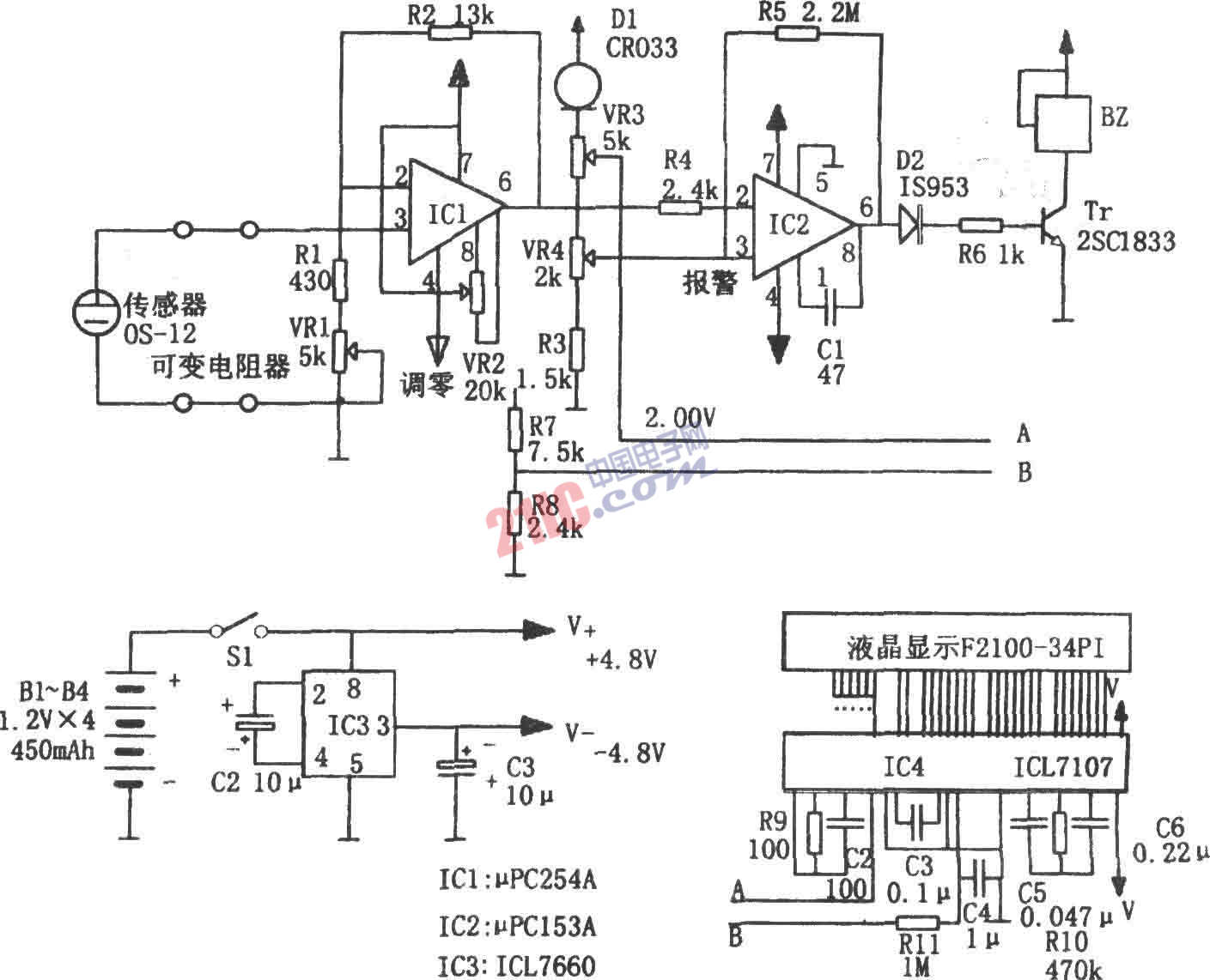 如圖所示為便攜式缺氧監(jiān)控電路。該電路由氧傳感器OS-12、直流放大器IC1、A/D變換器IC4、液晶顯示器F2100-34PI、電壓比較器IC2、正負電源變換器IC。等組成。OS-12為伽伐尼電池式氧傳感器,檢測空氣中的氧氣可輸出約50mV的信號,且其在0~100%的氧濃度范圍內有線性輸出,它的輸出-輸入A/D變換器能很精確地用數(shù)字顯示出氧濃度。 IC1是直流放大器,可將傳感器的輸出信號放大8倍。放大后的信號經IC4(ICL7107型)A/D變換后直接驅動液晶顯示器F2100?34PI,用數(shù)字顯示氧濃度。ICL7107是3.5位單片A/D變換器,當和LED顯示器組合使用時,消耗電流可降到1mA左右。D1是恒流二極管,以作A/D變換器的基準電壓。CR033是利用場效應管恒電流特性的元件,若提供330μA電流,其溫度系數(shù)接近于零。電壓比較器IC2的基準電壓從D1獲得,用于檢測18%以下氧的濃度,氧濃度低則報警。IC3是從正電源到負電源的變換器,自身漏電流很小。電源使用4只450mA的NiCd電池,可連續(xù)使用l00h。該電路可以監(jiān)控地下坑道和洞穴底部等工作場合的氧濃度,以防止缺氧發(fā)生事故。