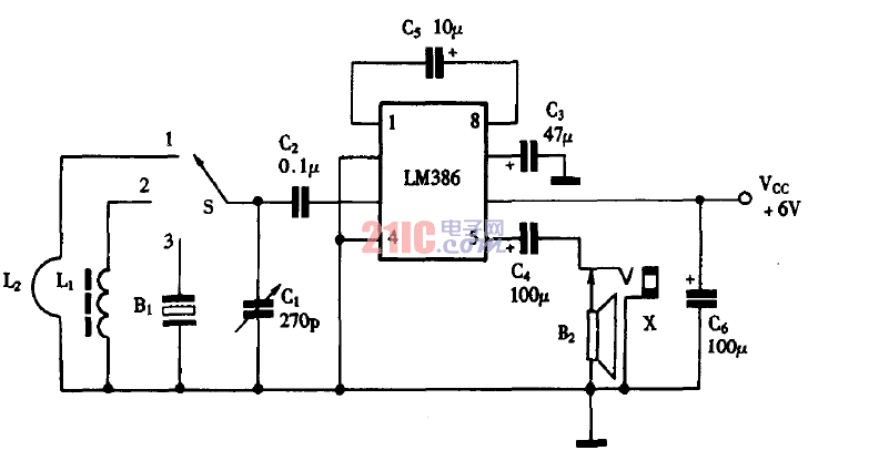 如圖為接收機(jī)原理圖。光電三極管VT2接收到對(duì)方發(fā)射來(lái)的光信號(hào)后,由集電極產(chǎn)生相應(yīng)的信號(hào)電壓,此信號(hào)電壓經(jīng)運(yùn)算放大器IC3放大,為了不衰減頻信號(hào),該放大器IC3選用了頻帶較