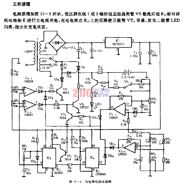 電路原理:AC220V市電經(jīng)變壓器T1降壓,經(jīng)D1-D4全波整流后,供給充電電路工作。當輸出端按正確極性接入設定的被充電瓶后,若整流輸出脈動電壓的每個半波峰值超過電瓶的輸