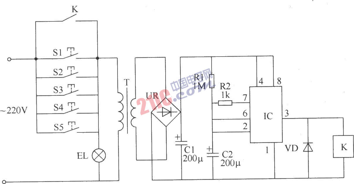 多地控制開關(guān)電路 元器件選擇 R1和R2選用1/4W或1/8W碳膜電阻器。 C1和C2均選用耐壓值為25V的鋁電解電容器。 VD選用1N4001或1N4007型硅整流二極管。 IC選用NE555型時(shí)基集成電路。 UR選用1A、50V的整流橋堆。 K選用JRX-13F型12V直流繼電器。 T選用3~5W、二次電壓為11~12V的電源變壓器。 S1~S5均選用觸頭電流大于5A的動(dòng)合(常開)型電源按鈕。 EL選用多只40~60W的燈泡并聯(lián)。