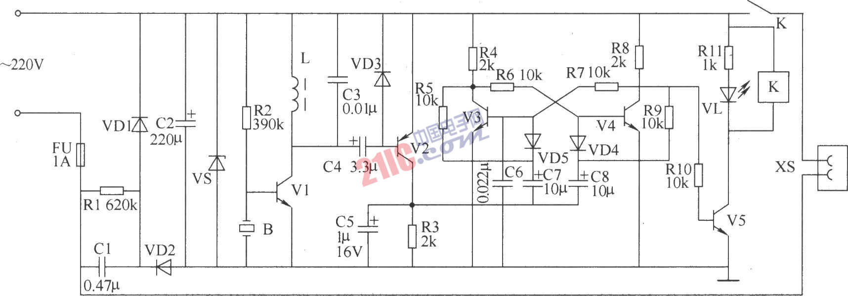 亞超聲遙控開關(guān)電路 元器件遠(yuǎn)擇 R1選用1/2W金屬膜電阻器;R2~R11選用1/4W碳膜電阻器或金屬膜電阻器。 C1選用耐壓值為400V的滌綸電容器或CBB電容器;C2、C4、C5、C7和C8均選用耐壓值為16V的鋁電解電容器;C3和C6均選用獨(dú)石電容器。 VD1和VD2均選用1N4007型硅整流二極管;VD3~VD5均選用1N4148型硅開關(guān)二極管。 VS選用1W、9V硅穩(wěn)壓二極管。 VL選用φ3mm的綠色發(fā)光二極管。 V1、V3和V4均選用S9018型硅NPN晶體管;V2選用S9015或3CGl20型硅PNP晶體管;V5選用C8050或3DG8050型硅NPN晶體管。 K選用9V直流繼電器,其觸頭電流容量可根據(jù)負(fù)載的功率而定。若控制100W以下的照明燈,則可選用4098型繼電器。 B選用φ27mm的壓電陶瓷片,使用時應(yīng)加助聲腔。