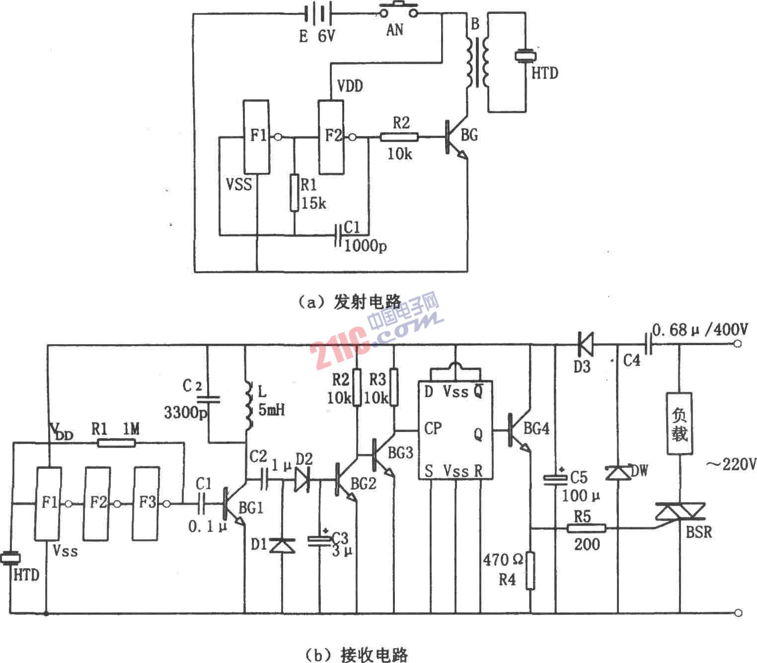 如圖所示為超聲波遙控開關(guān)電路。該電路由發(fā)射電路和接收開關(guān)電路組成。其中發(fā)射電路由多諧振蕩器、功率放大器、升壓變壓器B、壓電陶瓷片HTD和電源電路等組成,見圖(a)。接收開關(guān)電路由壓電陶瓷片HTD(與發(fā)射電路相同)、奇數(shù)級(jí)串聯(lián)放大器、D觸發(fā)器、諧振回路、直流電源電路等組成,見圖(b)。