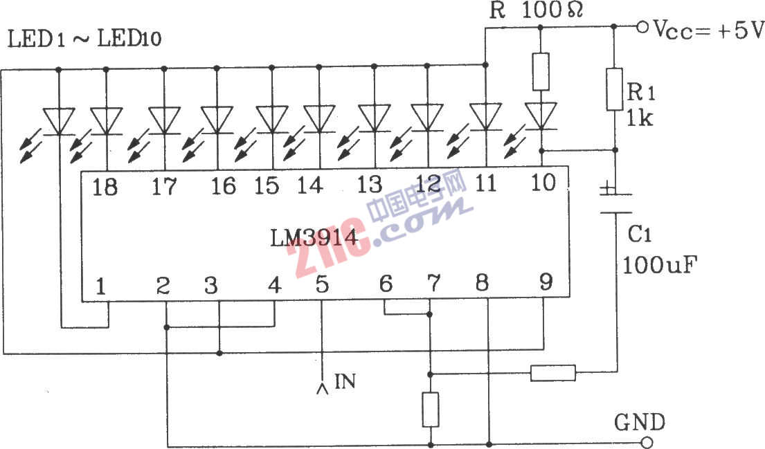 LM3914系列點/線圖形LED顯示驅(qū)動集成電路構(gòu)成的帶有閃光報警的LED顯示器電路