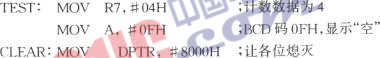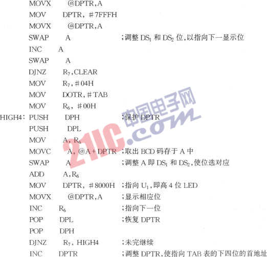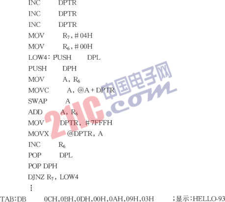 ICM7212AM 4位并行顯示/譯碼/驅(qū)動器(硬件譯碼)構(gòu)成的8位靜態(tài)LED顯示器電路下面給出顯示器顯示“HELL0-98”8個字符的編程程序清單。程序中設(shè)這8個字符存于表TAB開始的字節(jié)單元中,R7存放計數(shù)數(shù)據(jù),R6暫存數(shù)據(jù)。
