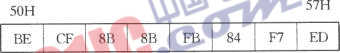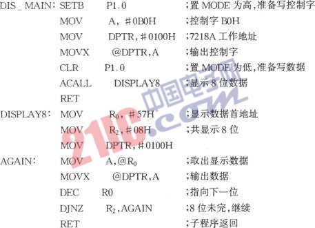 ICM7218A構成的8位LED動態(tài)顯示電路 圖為8031與ICM7218A接口組成的8位LED硬件掃描動態(tài)顯示器電路。由于ICM7218A兼有軟件譯碼和硬件譯碼功能,因此可用軟件譯碼和硬件譯碼兩種方法使顯示器顯示出“HELLO-92”.下面分別介紹。軟件譯碼編程 根據(jù)要顯示的內容先找出各字符的編碼。由a,b、c、d、e、f、g各段與數(shù)據(jù)位的對應關系可得出:H中a、d段為0,其余為l,即10111110或BEH。同樣E、L、O、一、9、2的編碼分別為:CFH、8BH、FBH、84H、F7H、EDH。如下所示,將HELLO-92字符編碼分別存入8031片內RAM 50H單元為首地址的8個字節(jié)單元中: