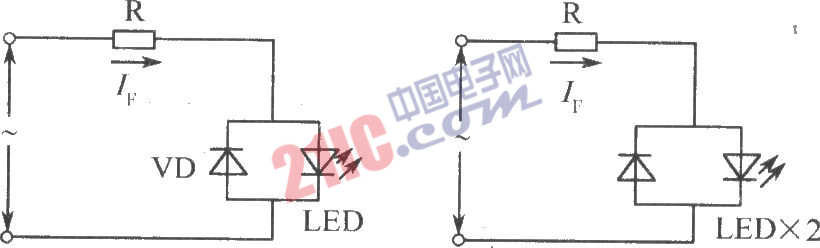 如圖所示,在未知電壓極性或電源極性是否接反的情況下仍可正常工作。與直流驅(qū)動一樣,交流驅(qū)動時,限流電阻R的取值為: