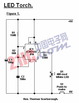 LED手電筒的核心是一個7555時基集成電路(不能使用普通的555)。一個白色的發(fā)光二極管(如果你找不到,只能用別的顏色代替)工作時發(fā)出的亮度大約為400mcd,這樣當聚焦時,可照亮30米遠的物體。