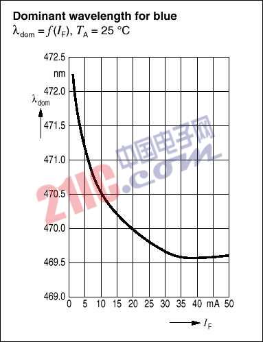 圖6:增加的正向電流通過改變其發(fā)射波長而改變了藍(lán)光LED的色彩。