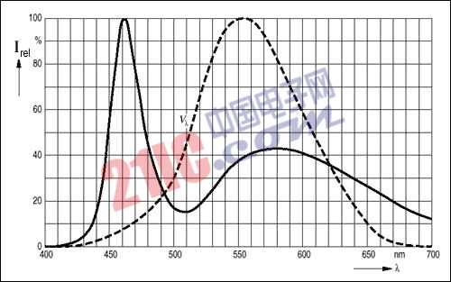 圖4:白光LED的發(fā)射波長(實線)包括藍(lán)光和黃光區(qū)域的峰值,但是在肉眼看來就是白色,肉眼的相對光敏感性(虛線)如圖所示。