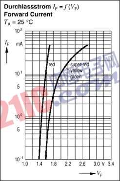 對于5mm直徑的標(biāo)準(zhǔn)LED,圖1給出了其正向?qū)妷?VF)與正向電流(IF)的函數(shù)曲線。