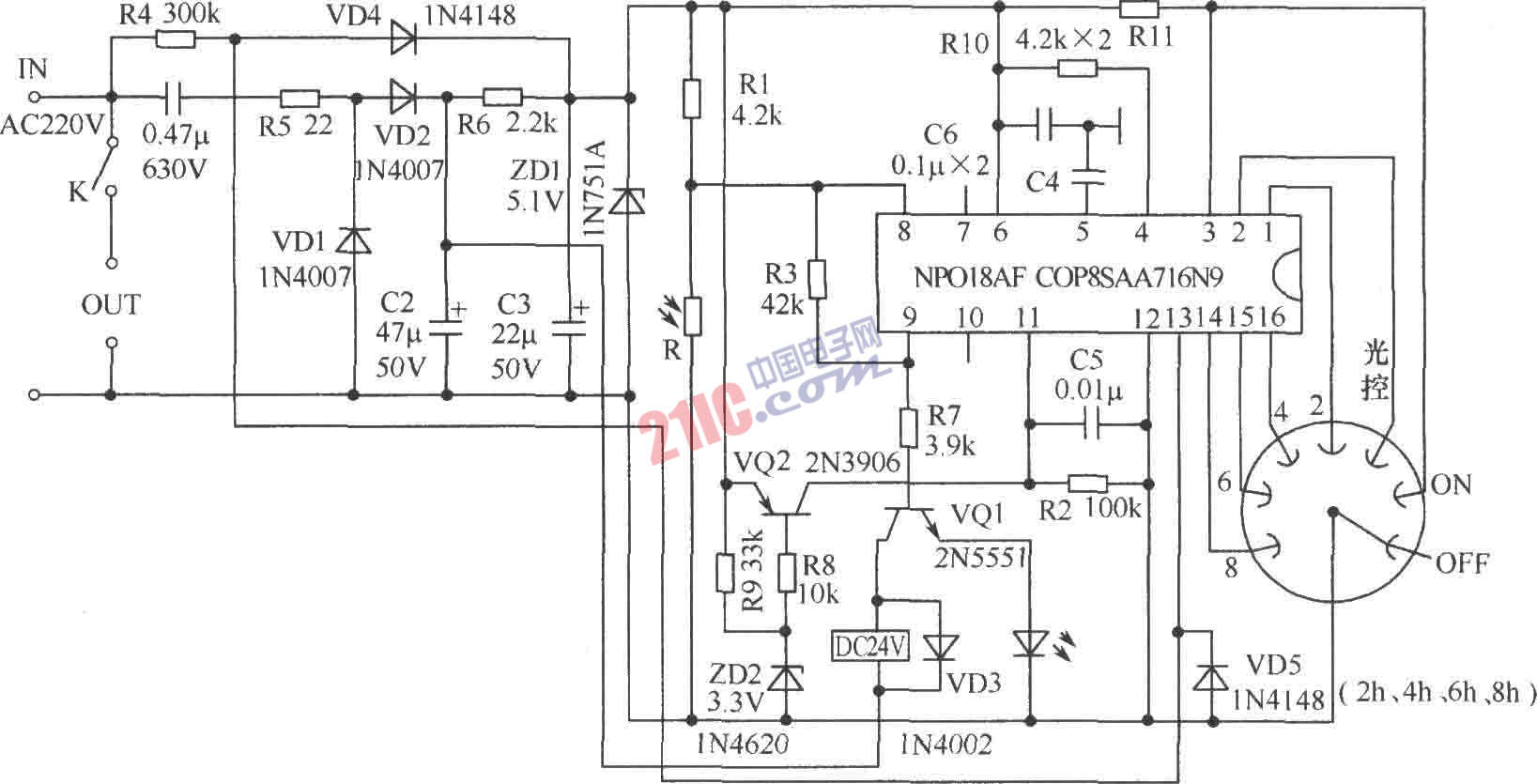 如圖所示為一款墨西哥光控定時(shí)開關(guān)電路,特別適用于戶外路燈及廣告燈箱供電控制,它是一款將光控功能和調(diào)擋定時(shí)合二為一的產(chǎn)品,該裝置電路簡單,容易制作。將旋轉(zhuǎn)開關(guān)擲于2h、4h、6h或8h的定時(shí)擋位,無光照時(shí)本電路將自動(dòng)控制給出的對應(yīng)時(shí)間,可達(dá)到節(jié)電及減少無效耗能的目的。