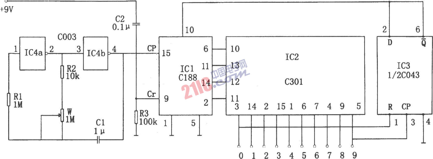 電源電路接通時。微分電路C2、R3給IC1的Cr端(⑨腳)提供一個正向尖脈沖,使IC1清零,相應(yīng)譯碼器IC2(C301)的“0”端(③腳)輸出高電平,該高電平又加至IC3的R端(①腳),使其置0,相應(yīng)⑥腳為高電平,lC1⑩腳為高電平,使IC1作加法計數(shù)。當(dāng)C003向IC1送入一個計數(shù)脈沖時,IC1的QA~QD端(6、11、14、2腳)的BCD碼經(jīng)二-十進制譯碼器IC2譯碼后,在其“0”~“9”十個輸出端(3、14、2、15、1、6、7、4、9、5腳)依次輸出高電平。若此十個輸出端通過接口電路與繼電器或可控硅相連,則可使繼電器或可控硅所掛彩燈從“0”~“9”依次點亮。