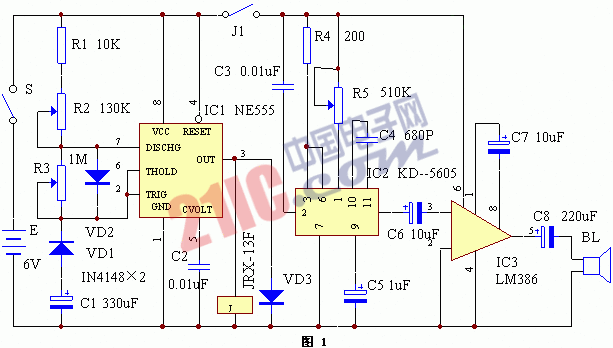 電路工作原理見1。由時間控制電路、貓叫聲發(fā)生電路、功率放大電路等組成。時間控制電路是由時基電路IC1 NE555及其外圍阻容元件、二極管等組成。它是一個占空比可調(diào)的脈沖振蕩器,其占空比由R2和R3控制。貓叫聲發(fā)生電路由一塊CMOS集成電路IC2 KD-5605擔任,利用存貯技術將貓叫聲固化在電路內(nèi)部。功率放大器采用價廉物美的通用小功率音頻放大集成電路IC3 LM386,它的特點是外圍元件極少,電壓范圍寬,失真度小,裝配簡單。