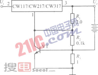 如圖所示是具有限流保護(hù)的充電器。晶體管VT和電阻R3組成限流網(wǎng)絡(luò)。從圖中可知,電阻R3是晶體管VT的基極一發(fā)射極問(wèn)電阻,與被充電電池串聯(lián)在一起。充電電流流過(guò)電阻R3。當(dāng)充電電流過(guò)大時(shí),R3上的電壓降超過(guò)0.6V,就會(huì)使晶體管VT導(dǎo)通。因VT與電阻R2并聯(lián),VT的導(dǎo)通,使等效并聯(lián)電阻減小,輸出電壓Uo降低,輸出電流減小,從而達(dá)到限制充電電流的目的。當(dāng)取R3=lΩ)時(shí),最大充電電流為Iom=0.6/1=0.6A,選取更小的R3會(huì)得到更大的充電電流,但不能超過(guò)集成穩(wěn)壓器最大的輸出電流值。