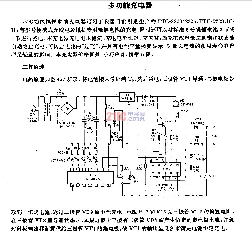 這個鎳鎘電池自動充電器,具有狀態(tài)指示功能。充電時發(fā)光二極管發(fā)綠光;充滿后,保護電路動作,發(fā)光二極管發(fā)紅光,指示電池已充滿......