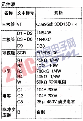 振蕩管VT為大功率管,要求 BVceo>200V。1cm>8A.如C3995。散熱器面積不應(yīng)小于75cm2。若無此類管。可用四個(gè)3DDl5D并聯(lián)使用(如圖2所示).但需要這四個(gè)管子的參數(shù)盡量一致。避免個(gè)別管性能差異大發(fā)熱不均而燒壞。R2選用10Ω/10W的水泥電阻:D9為擊穿電壓30V的觸發(fā)二極管DB3 可控硅 SCR選用20A,耐壓600V的螺栓型單向可控硅.如 EGE06-06。其外形和引腳如圖3所示。 C3采用25μ、450V的油浸電容。值得一提的是,此電容若用電解電容時(shí).效果不好。且易損壞。