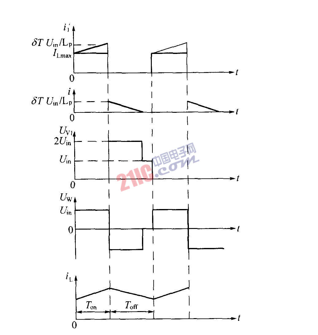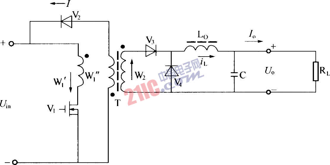 如圖所示,當(dāng)開關(guān)管V1導(dǎo)通時(shí),輸入電壓Uin全部加到變換器初級線圈W1'兩端,去磁線圈W1''上產(chǎn)生的感應(yīng)電壓使二極管V2截止,而次級線圈W2上感應(yīng)的電壓使V3導(dǎo)通,并將輸入電流的能量傳送給電感Lo和電容C及負(fù)載;與此同時(shí)在變壓器中建立起磁化電流,當(dāng)V1截止時(shí),V3截止,Lo上的電壓極性反轉(zhuǎn)并通過續(xù)流二極管 V4繼續(xù)向負(fù)載供電,變壓器中的磁化電流則通過W1''、V2向輸入電源Uin釋放而去磁;W1''具有鉗位作用,其上的電壓等于輸入電壓Uin,在V1再次導(dǎo)通之前,T中的去磁電流必須釋放到零,即T中的磁通必須復(fù)位,否則,變壓器T將發(fā)生飽和導(dǎo)至V1損壞。通常W1'=W1'',采用雙線并繞耦合方式的占空比<0.5,否則T將飽和。單端正激式變換器波形如下圖所示。