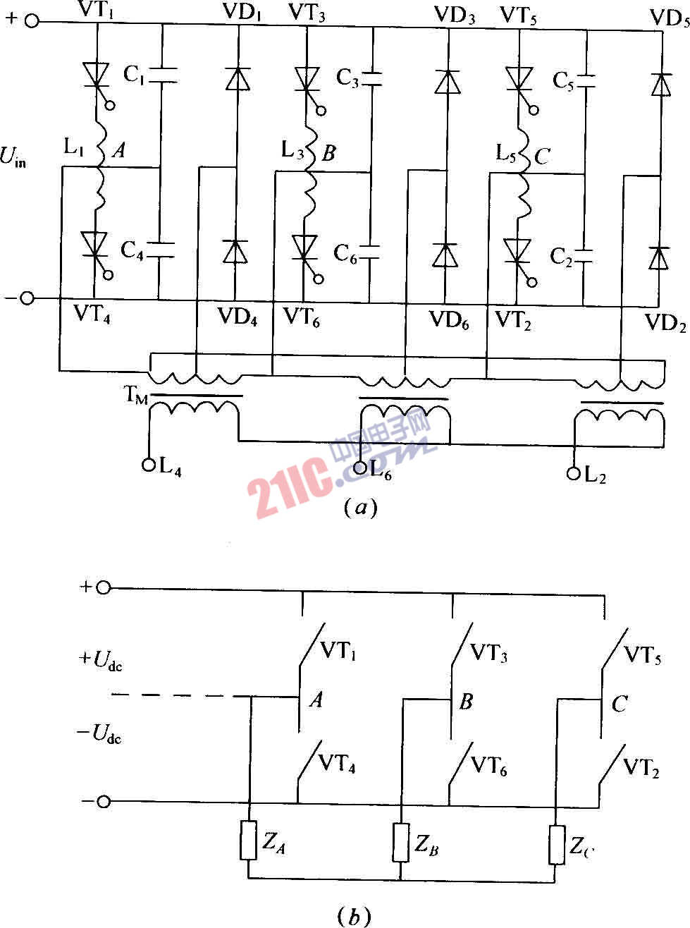 傳統(tǒng)的三相橋式逆變器電路如圖(a)所示。圖中,VT1~VT6為晶閘管,L1~L6為換向電感,C1~C6為換向電容,兩者組成晶閘管關(guān)斷電路。VD1~VD6為反饋二極管。依據(jù)晶閘管工作原理,在三相交流輸入電源作用下,若晶閘管承受最大正向陽(yáng)極電壓,而控制極又獲得觸發(fā)脈沖時(shí)便轉(zhuǎn)入導(dǎo)通狀態(tài)。反之處于導(dǎo)通狀態(tài)的晶閘管在足夠的反向陽(yáng)極電壓作用下會(huì)轉(zhuǎn)為截止?fàn)顟B(tài)。圖(b)為圖(a)的簡(jiǎn)化圖。