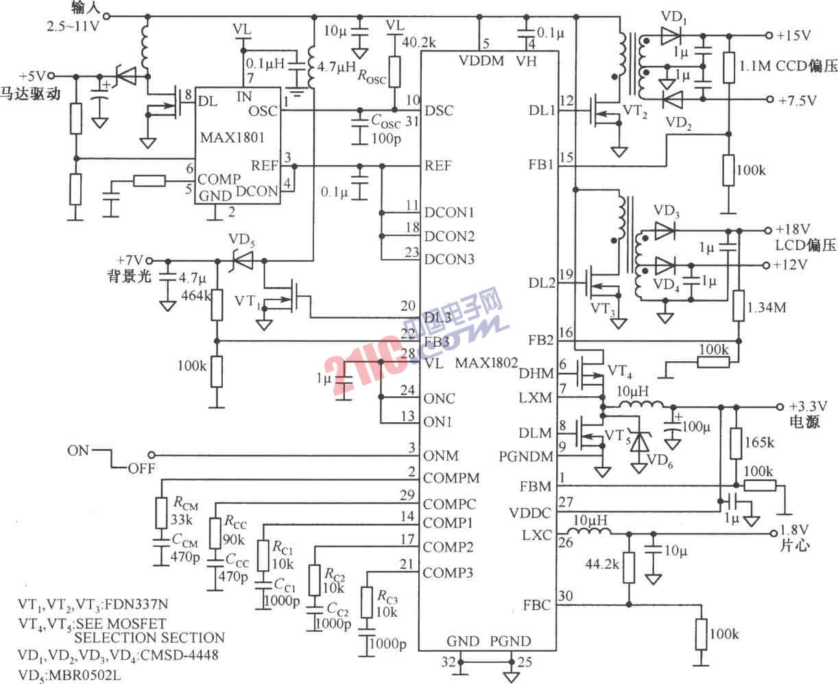 由MAX1802構成的多路輸出數(shù)碼相機電源電路如圖所示。MAX1802芯片有兩個降壓變換器和三個升壓變換器,輸入電壓范圍為2.5~11V,輸出電壓為2.7~5.5V連續(xù)可調,最低輸出電壓可以調節(jié)到1.25V。MAX1802的工作頻率可達1MHz,變換效率可達94%。 |