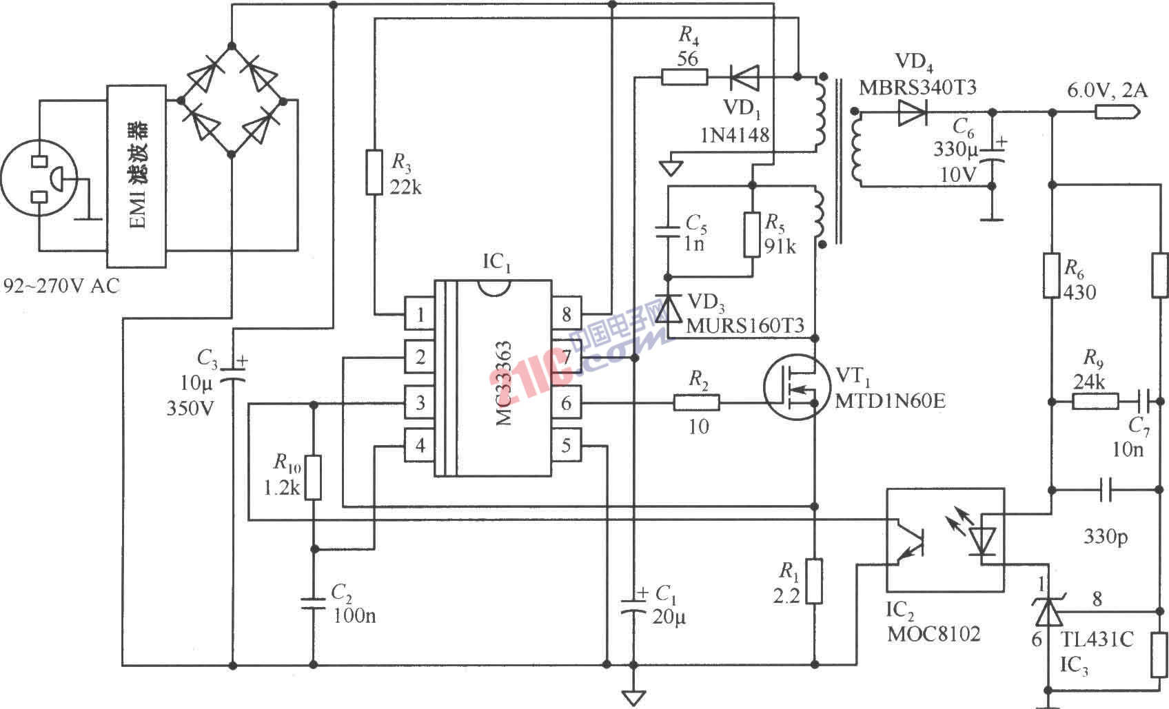 由MC33363構(gòu)成的6V/2A隔離式開關(guān)穩(wěn)壓電源電路