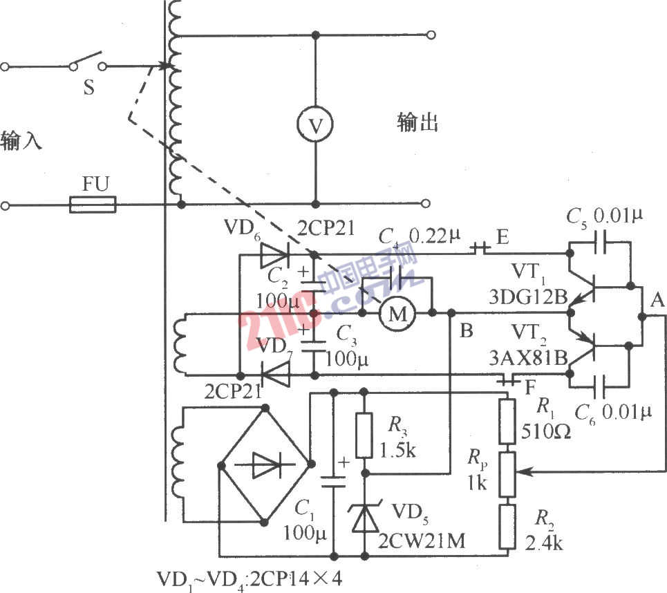 如圖為200W自動(dòng)調(diào)壓式交流穩(wěn)壓電源電路圖。圖中用虛線框出的部分,它們的工作是緊密聯(lián)系的。當(dāng)調(diào)壓變壓器輸出偏離220V時(shí),其變壓器次級(jí)一個(gè)繞組取得這個(gè)誤差信號(hào),送到VD1~VD4橋式整流,再經(jīng)Cl濾波后,變成直流電壓,再由R1、RP、R2組成的取樣電路取樣,調(diào)整RP,若A點(diǎn)電壓高于B點(diǎn)電壓(B點(diǎn)為VD5穩(wěn)壓的基準(zhǔn)電壓),則放大部分的VT1導(dǎo)通(因?yàn)閂T1為NPN管,集電極電壓為正),并放大,迫使電動(dòng)機(jī)M轉(zhuǎn)動(dòng)。電動(dòng)機(jī)的轉(zhuǎn)動(dòng)就帶動(dòng)了調(diào)壓器的滑動(dòng)臂移動(dòng)。移動(dòng)的方向是使輸出電壓降低。相反,若調(diào)整RP,A點(diǎn)電壓低于B點(diǎn)電壓時(shí),則是放大部分的VT2導(dǎo)通(VT2為PNP管,集電極電壓為負(fù)),并放大,迫使電動(dòng)機(jī)M向相反方向轉(zhuǎn)動(dòng),從而使調(diào)壓器的滑動(dòng)臂向電壓升高的方向滑動(dòng)。這就保證了調(diào)壓器輸出的穩(wěn)定。當(dāng)然,當(dāng)輸出電壓無(wú)誤差時(shí),A點(diǎn)與B點(diǎn)等電位,兩只三極管都處于截止?fàn)顟B(tài),電動(dòng)機(jī)不動(dòng)。 |