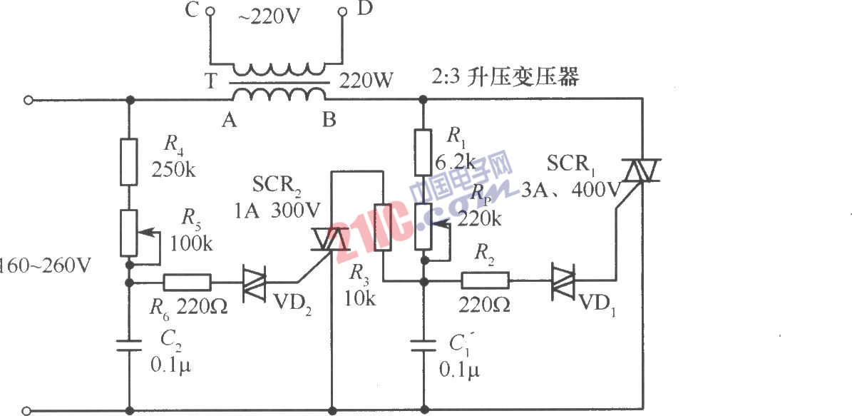 如圖是一個由雙向可控硅組成的交流穩(wěn)壓器電路。與單向可控硅穩(wěn)壓器相比較,其線路簡單,性能可靠。當電網(wǎng)電壓小于220V時,雙向可控硅SCR2控制極上的電壓也隨電網(wǎng)電壓減小而降低,致使VD2導通角小,C1端電壓上升,從而使雙向可控硅SCRl控制極電壓升高,使輸出電壓上升。反之,輸出電壓下降,達到穩(wěn)壓。