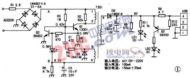 MP3充電器是最易損壞的配件之一。筆者維修多款充電器后發(fā)現(xiàn),它們基本上都是采用開關(guān)電源電路,電路結(jié)構(gòu)大同小異。本文以市面上最常見的昕潮TJ-01型充電器為例,簡(jiǎn)述其工作原理與常見故障檢修,電路見圖1。