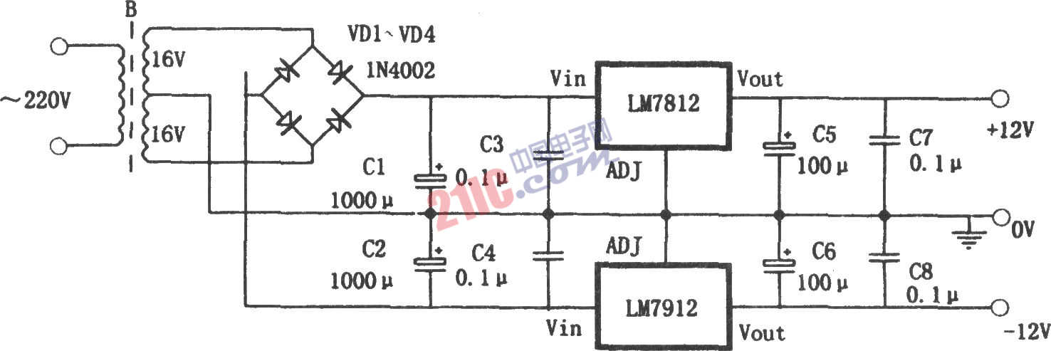 如圖所示為雙極性對稱穩(wěn)壓電源電路,它采用兩只三端穩(wěn)壓器,7812和7912構成的簡單實用的對稱型正負穩(wěn)壓電源。該電源輸出電壓為±12V,輸出電流最大為l.5A。對7812和7912的選擇,力求性能參數(shù)盡量對稱。正、負三端穩(wěn)壓器均要加裝合適的散熱器。 |