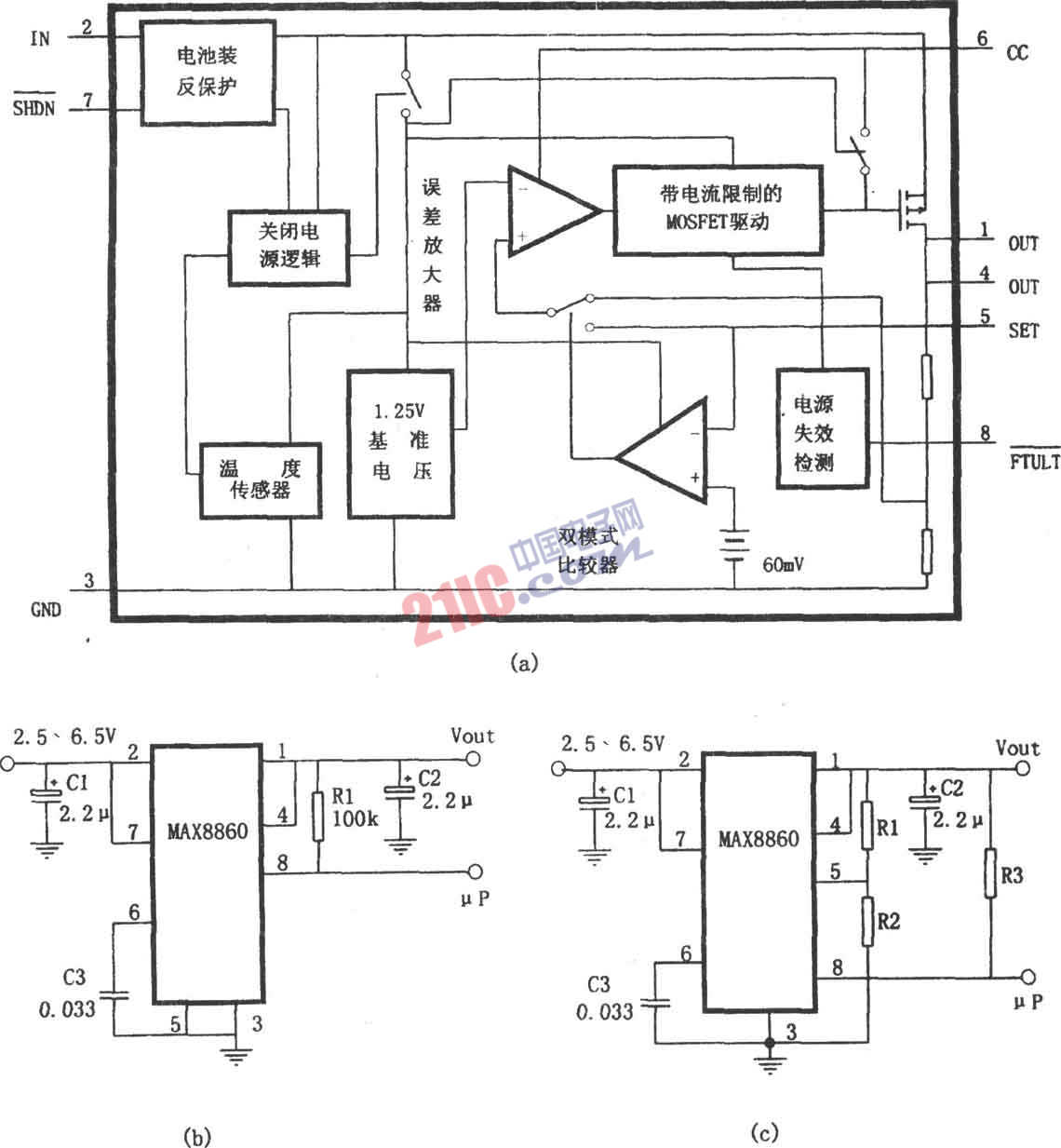 MAX8860的內(nèi)部結(jié)構(gòu)、管腳排列如圖(a)所示。它由1.25V基準(zhǔn)電壓源,誤差放大器,MOSFET驅(qū)動(dòng)器、P溝道MOSFET調(diào)整管、雙模式電壓比較器、電源失效檢測器及內(nèi)部反饋的電壓分壓器組成。
