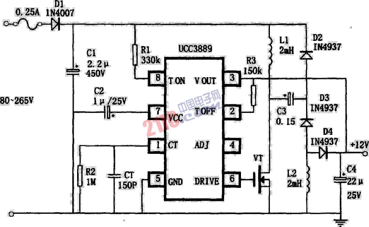 如圖所示為UCC3889組成的非隔離12V直流穩(wěn)壓電源,輸出功率為1W,最低開關頻率為100kHz,總效率約為50%。