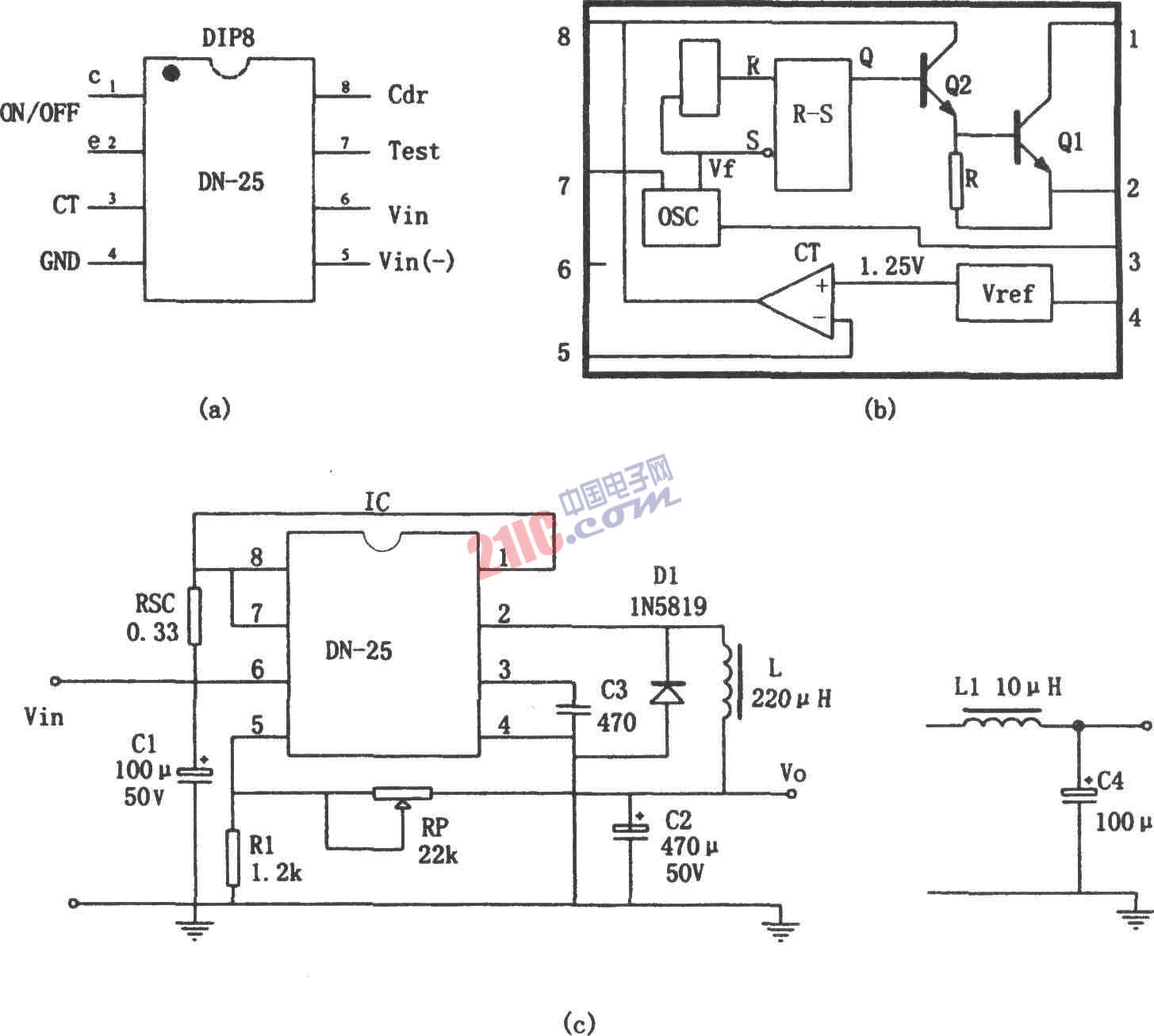 如圖所示為由DN-25集成電路的開關(guān)穩(wěn)壓電源。DN-25是單片開關(guān)型穩(wěn)壓電源器件,適合制作中等輸出電流、寬調(diào)壓范圍的穩(wěn)壓電源。它的主要性能指標(biāo)如下:輸入電壓VIN=3~40V,輸出電壓Vo=1.25~24V(連續(xù)可調(diào)),最大輸出電流IOM=1A,最大輸出功率POM=36W,負載短路限制電流IOSH≤1.1A。DN-25采用8腳雙排直插式封裝(DIP-8),其內(nèi)部電路主要包括:(1)振蕩器(OSC);(2)R-S觸發(fā)器;(3)輸出開關(guān);(4)電壓基準(zhǔn)(VREF=1.25V)和比較器。DN-25內(nèi)部振蕩器的振蕩頻率f由③腳所接入的定時電容CT決定,f=1/CT。