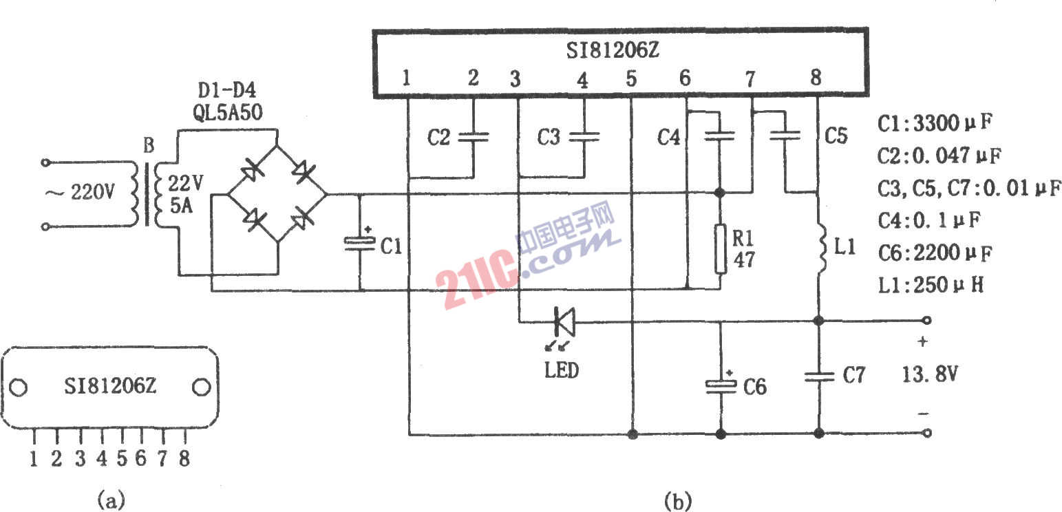 如圖所示為采用SI81206Z模塊構成的13.8V開關穩(wěn)壓電源。該13.8V電源用于基地臺、車載臺等電子儀器上,具有效率高、結構簡單、性能可靠等特點。