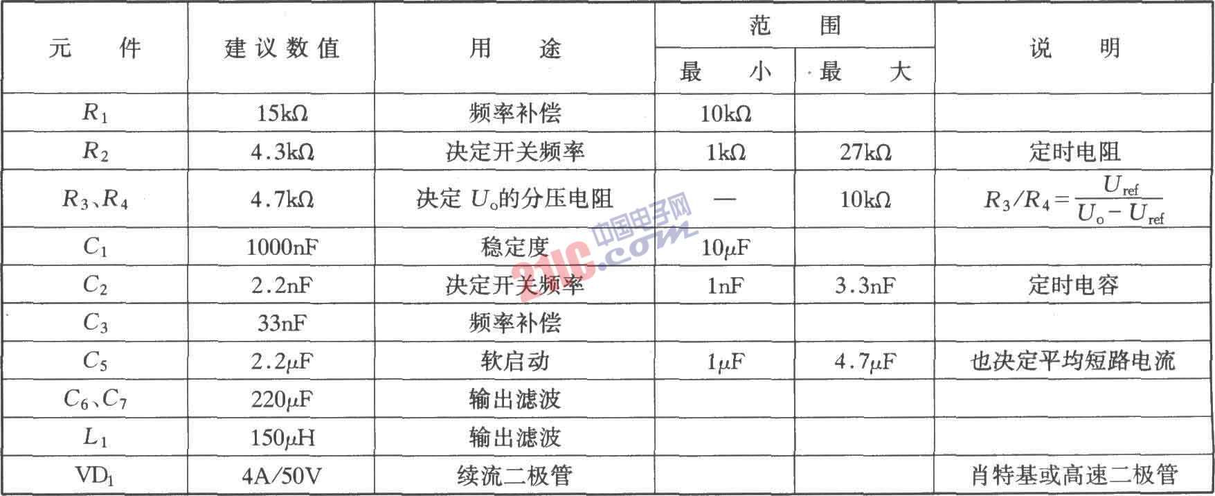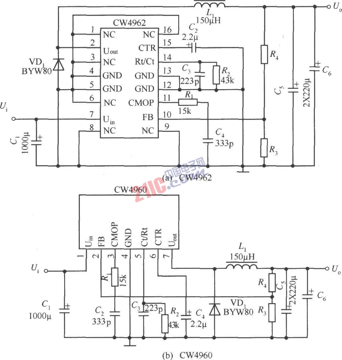 如圖所示是CW4962/CW4960的典型應(yīng)用電路。該電路最大輸入電壓為50V,輸出電壓可以5V調(diào)至40V。輸入直流電壓的獲得可以用工頻變壓器從交流220V降壓獲得,也可以用單端反激式開關(guān)穩(wěn)壓器獲得。外圍元件的選擇如下表所示。