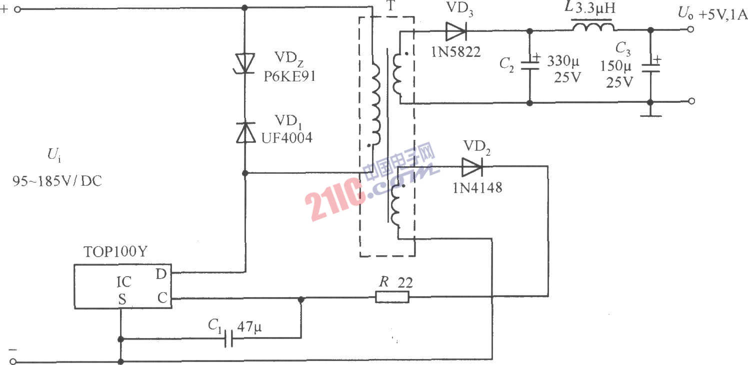 由TOP100Y構(gòu)成的+5v、1A輸出的反激式直流開關(guān)穩(wěn)壓電源電路如圖所示。這種反激式開關(guān)電源是通過反饋電路直接調(diào)節(jié)輸出電壓的,適用于需要隔離且負(fù)載變化小的情況。當(dāng)直流輸入電壓Ui=95~185V時(shí),電壓調(diào)整率Sv=±1.25%。當(dāng)負(fù)載電流從l0%變化到l00%時(shí),負(fù)載調(diào)整率SI=±4.5%。輸出紋波電壓為±25mV。開關(guān)頻率仍為100kHz(典型值)。
