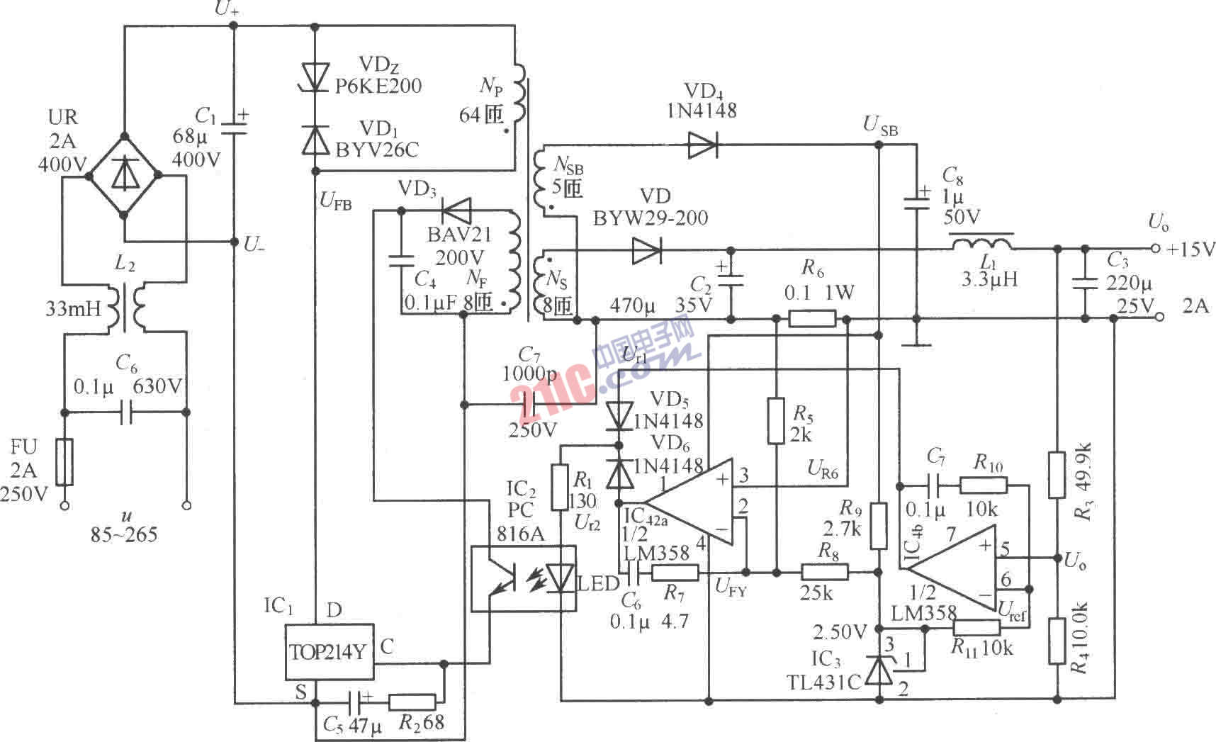 [導(dǎo)讀]由TOP214Y構(gòu)成的15V、2A恒壓/恒流型開(kāi)關(guān)電源電路如圖所示。電路采用了4片集成電路:IC1是TOP214Y單片開(kāi)關(guān)電源;IC2是PC816A型線性光電耦合器;IC3是TL431C可調(diào)式并聯(lián)穩(wěn)壓器;IC4是低功耗雙運(yùn)算放大器LM358。其中IC4