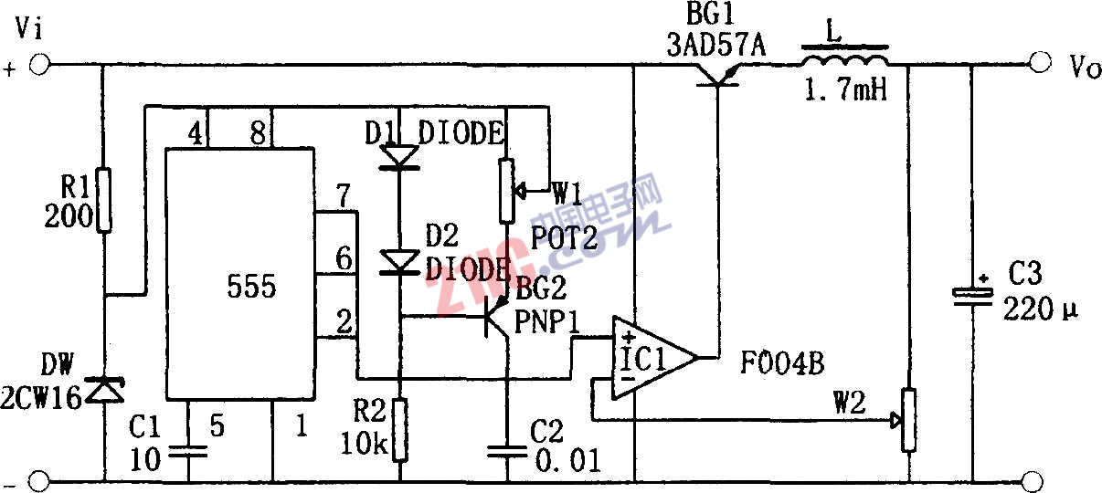如圖所示為用555構(gòu)成的升壓型開(kāi)關(guān)穩(wěn)壓電源電路。電路中,采用晶體管BG1作為開(kāi)關(guān)調(diào)整管;運(yùn)算放大器IC1構(gòu)成比較放大器;555時(shí)基電路接成無(wú)穩(wěn)態(tài)多諧振蕩器。振蕩器在C1上產(chǎn)生鋸齒波電壓(Vmin=1/3Vz,Vmax=2/3Vz,頻率由W1和C1確定)送至比較器IC1的同相輸入端,取樣電壓送至比較器的反相輸入端。IC1輸出矩形波形的占空比由取樣電壓控制,在輸出電壓為一穩(wěn)定值時(shí),取樣電壓為1/3Vz和2/3Vz之間某一值。當(dāng)某種原因使輸出電壓上升(或下降)時(shí),取樣電壓隨之上升(或下降),使IC1輸出矩形波占空比減小(或增大),導(dǎo)通時(shí)間減短(或增加),輸出電壓下降(或上升),從而達(dá)到穩(wěn)定輸出電壓的目的。調(diào)整W,可控制輸出電壓的大小。