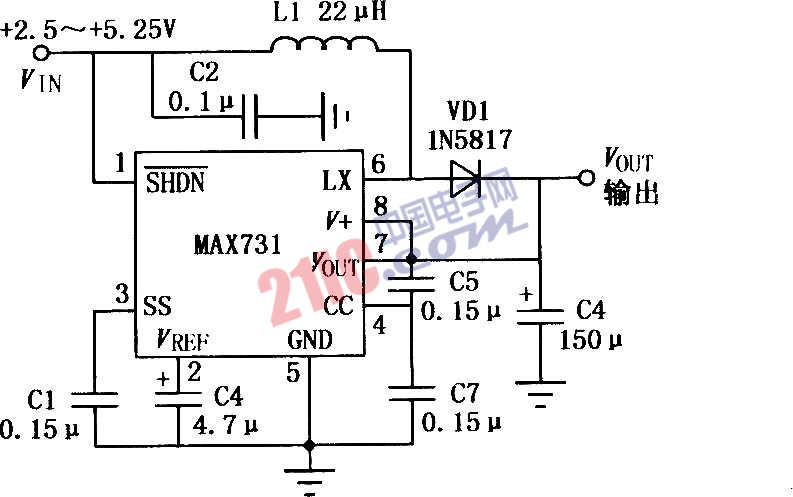 MAX731為開關(guān)控制型DC?DC升壓變換器,使用2節(jié)5號(hào)電池便能產(chǎn)生5V、200mA的直流電壓,其轉(zhuǎn)換效率可達(dá)82%~87%。MAX731空載時(shí)耗電極低(僅2mA),且采用電流型脈寬調(diào)制,有較高的輸出電壓精度,可用于便攜式電子儀器、儀表等設(shè)備。其典型應(yīng)用電路如圖所示。