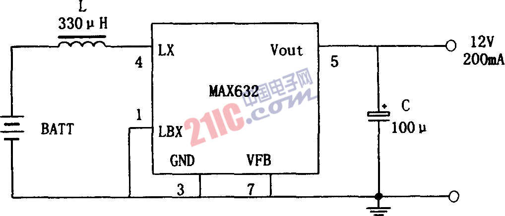 如圖所示為用MAX632組成的高效升壓穩(wěn)壓電源。MAX632是一種效率高,外圍元件少,低功耗的集成型開關(guān)穩(wěn)壓器。由于開關(guān)功率管和續(xù)流二極管已集成在芯片內(nèi)部,因此MAX632外部只需接一只儲(chǔ)能電感和一只濾波電容即可方便地組成一個(gè)升壓變換電源電路。本電源的輸入電壓范圍在+1.5V至+12V之間。