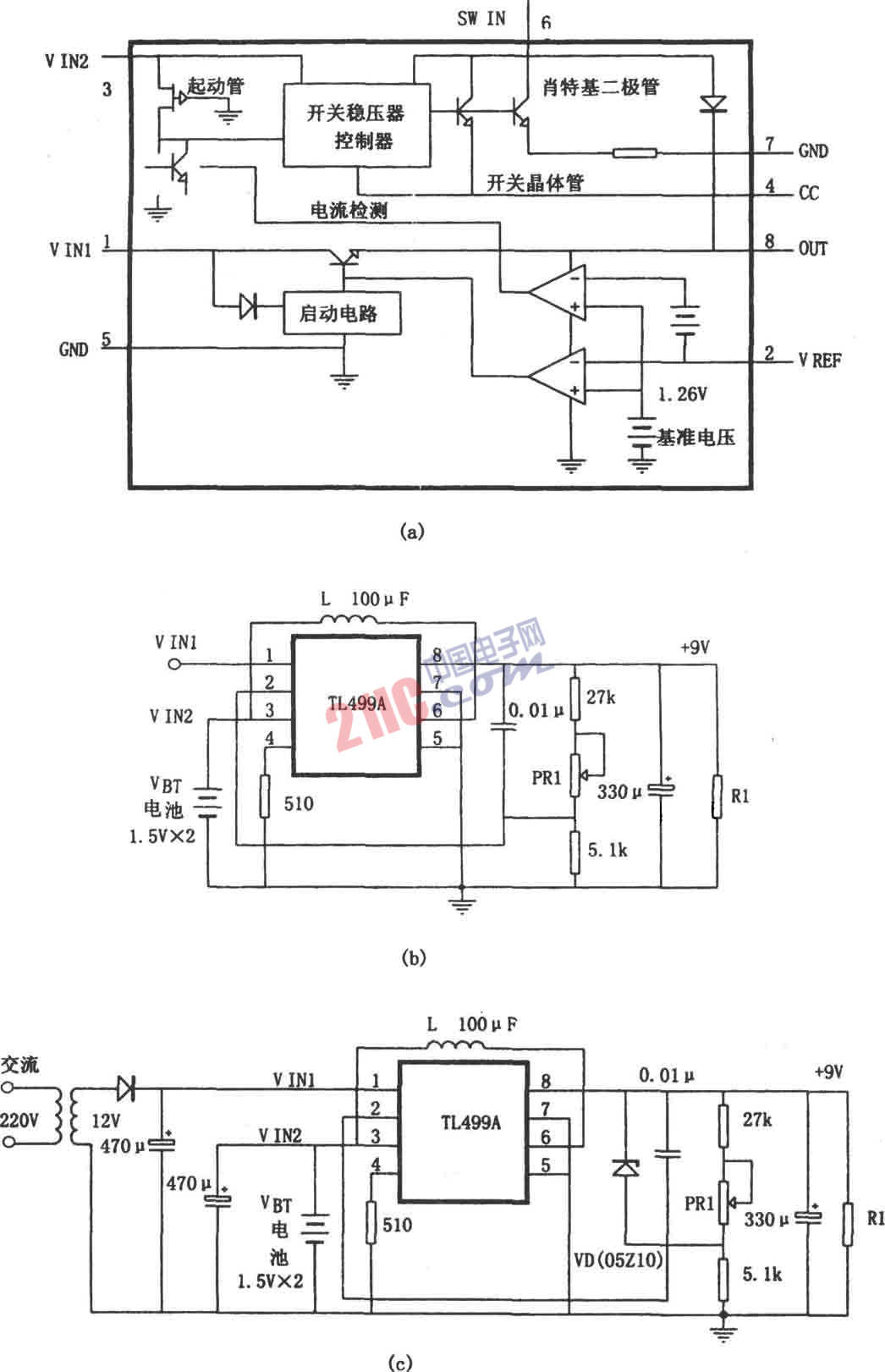 圖(c)所示為采用TL499A構(gòu)成的電池后備電源電路。若輸入端VIN1(1腳)加直流電壓,就可獲得9V輸出電壓。它工作于線性穩(wěn)壓器狀態(tài),噪聲非常小,但前提是輸入電壓VIN1應(yīng)比輸出電壓VOUT高出1V。在圖(b)所示電路中,TL499A 1腳的輸入電壓VIN1可由交流220V通過變壓整流來提供,作為本電源電路的主要供電電壓。若VIN1為10V以上,就工作于線性穩(wěn)壓器狀態(tài);若輸入電壓VIN1低于l0V,就工作于開關(guān)穩(wěn)壓器狀態(tài),此時(shí)由電池通過TL499A③腳供電,經(jīng)升壓變換后輸出。停電時(shí)電池作為后備電源,這樣可方便構(gòu)成不間斷電源。線性穩(wěn)壓器與開關(guān)穩(wěn)壓器之間的轉(zhuǎn)換在TL499A的內(nèi)部自動進(jìn)行,雖然輸出電壓有些變動,但只有2%左右,一般用途不受影響。輸入電壓VIN1最高為32V。