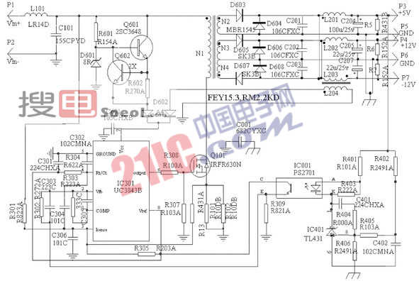 電源工作原理如下:電路采用單端正激變換電路,當變換器接通電源時,輸入直流電壓經(jīng)由電阻、12V穩(wěn)壓管D601和三極管Q601、Q602組成的電路穩(wěn)壓降壓后, 啟動UC3843進入正常工作,偏置繞組L204的供電電路開始工作,輸出經(jīng)A4和C601整流及濾波后輸出12V電壓,高于自供電電壓,使二極管A4反偏,啟動電路停止工作。變換器進入正常工作后,電源依據(jù)PWM脈寬調(diào)制方式工作,次級繞組的輸出經(jīng)過二極管整流以及電容器和電感器組成的LC型濾波器濾波后,產(chǎn)生所需的各路輸出直流電壓。+5V的輸出電壓由電阻器R402和R406分壓后,與可編程穩(wěn)壓源TL431(U3)中的2.5V參考電壓比較,然后通過光耦合器U2反饋到UC3843的2腳,控制脈沖的占空比,穩(wěn)定5V輸出。耦合電感L202和L203實現(xiàn)+/-12V兩路穩(wěn)壓。過流保護電阻R101、R102檢測到開關(guān)管的過流信號,送入3843的3腳,封鎖UC3843的輸出信號,實現(xiàn)過流保護。