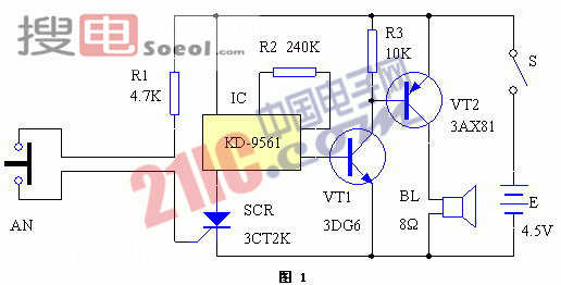 電路原理見圖1。SCR、R1和AN組成可控硅觸發(fā)開關(guān)電路;IC1、R2、VT1、VT2和BL組成模擬警笛聲電路。平時(shí),AN受到家用電器的壓迫,使其兩常閉觸點(diǎn)斷開,SCR無觸發(fā)信號(hào)而阻斷,報(bào)警器不工作。當(dāng)家用電器被搬起時(shí),AN兩觸點(diǎn)自動(dòng)閉合,SCR的觸發(fā)端經(jīng)R1從電源正極獲得觸發(fā)信號(hào),SCR導(dǎo)通,IC1通電工作,其輸出端輸出的警笛聲電信號(hào)經(jīng)VT1、VT2功率放大,推動(dòng)揚(yáng)聲器發(fā)出宏亮的報(bào)警聲。此時(shí),即使將家電放回原處或破壞掉AN,也無法阻止報(bào)警聲。只有主人打開與報(bào)警器安裝在一起且其他人一時(shí)很難找到的開關(guān)S,才能解除報(bào)警。