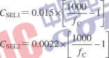 通過外部電容CSEL1、CSEL2可將低通濾波器的截止頻率設(shè)置在1kHz以下,以滿足窄帶應(yīng)用的需要,電路如圖所示。電容量的計算公式如下: