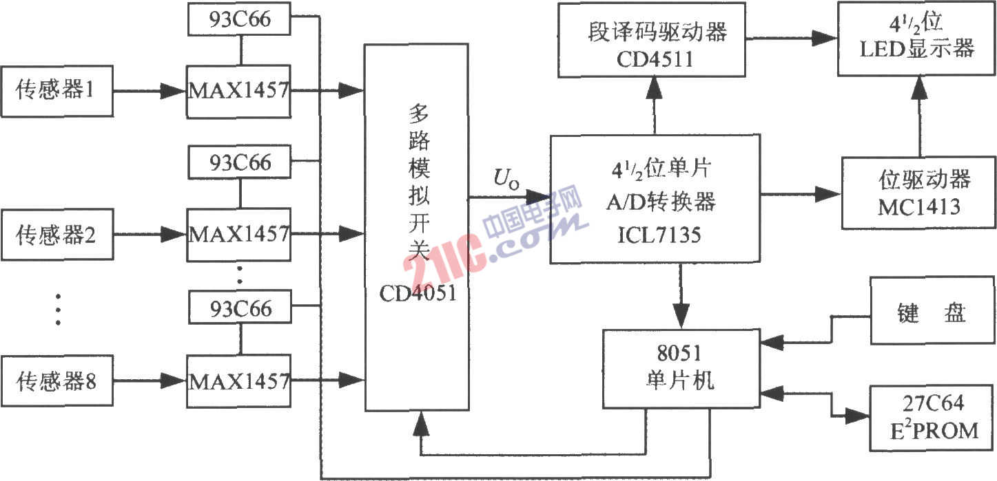 [導讀]利用多片MAX1457亦可配單片A/D轉換器和單片機,構成多通道壓力巡檢儀,電路框圖如圖所示。圖中采用一片八選一模擬開關CD4051,最多可接收8路傳感信號。每只傳感器的校準系數都存儲在93C66中。CD4051的輸出接ICL7135