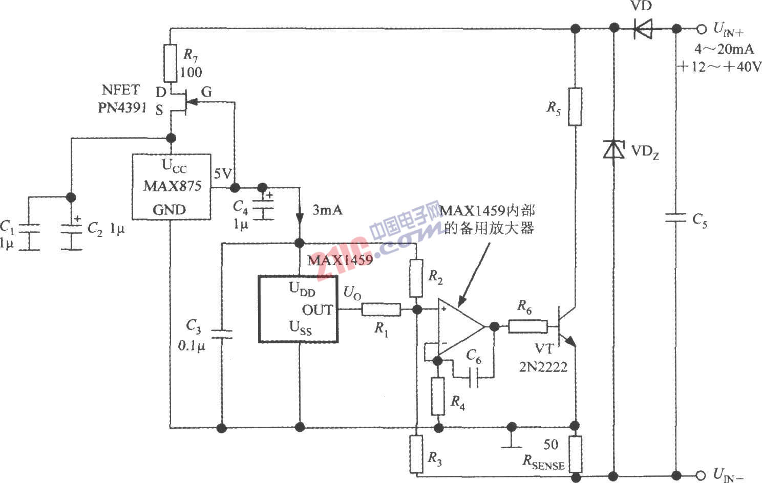 由MAX1459構(gòu)成的4~20mA電流變送器的電路如圖所示。將PGA的輸出電壓送至芯片中的備用放大器,再通過外部功率放大電路即可獲得4~20mA的電流輸出,在遠(yuǎn)距離傳輸電流時(shí),電流信號的精度不受電纜線的電阻的影響。PN4391為40V、150mA的N溝道場效應(yīng)管(NFET)。MAX875為低功耗、低漂移的5V帶隙基準(zhǔn)電壓源,其電壓溫度系數(shù)為7×10-6/℃。由PN4391和MAX875構(gòu)成3mA的恒流源,給MAX1459提供穩(wěn)定的工作電流,再利用MAX1459進(jìn)行溫度補(bǔ)償和增益補(bǔ)償(圖中省略了壓力傳感器)。MAX1459的輸出電壓依次經(jīng)過備用放大器、功率放大器轉(zhuǎn)換成4~20mA的電流信號,允許環(huán)路電源范圍是+12~40V。VT采用2N2222型功率管,其主要參數(shù)為:UCEO=60V,ICM=0.8A。在UIN+、UIN-之間并聯(lián)了一只穩(wěn)壓管,能起到過壓保護(hù)作用。檢測電阻RSENSE兩端的初始電壓由電阻R1~R4來設(shè)定,RSENSE上的信號電壓則受MAX1459控制。當(dāng)RSENSE=50Ω時(shí),可用0.2~1.0V的標(biāo)準(zhǔn)電壓進(jìn)行校準(zhǔn)。C1~C3為退耦電容,C4、C5為濾波電容,C6為頻率補(bǔ)償電容。R5、R6分別為集電極電阻和基極電阻。